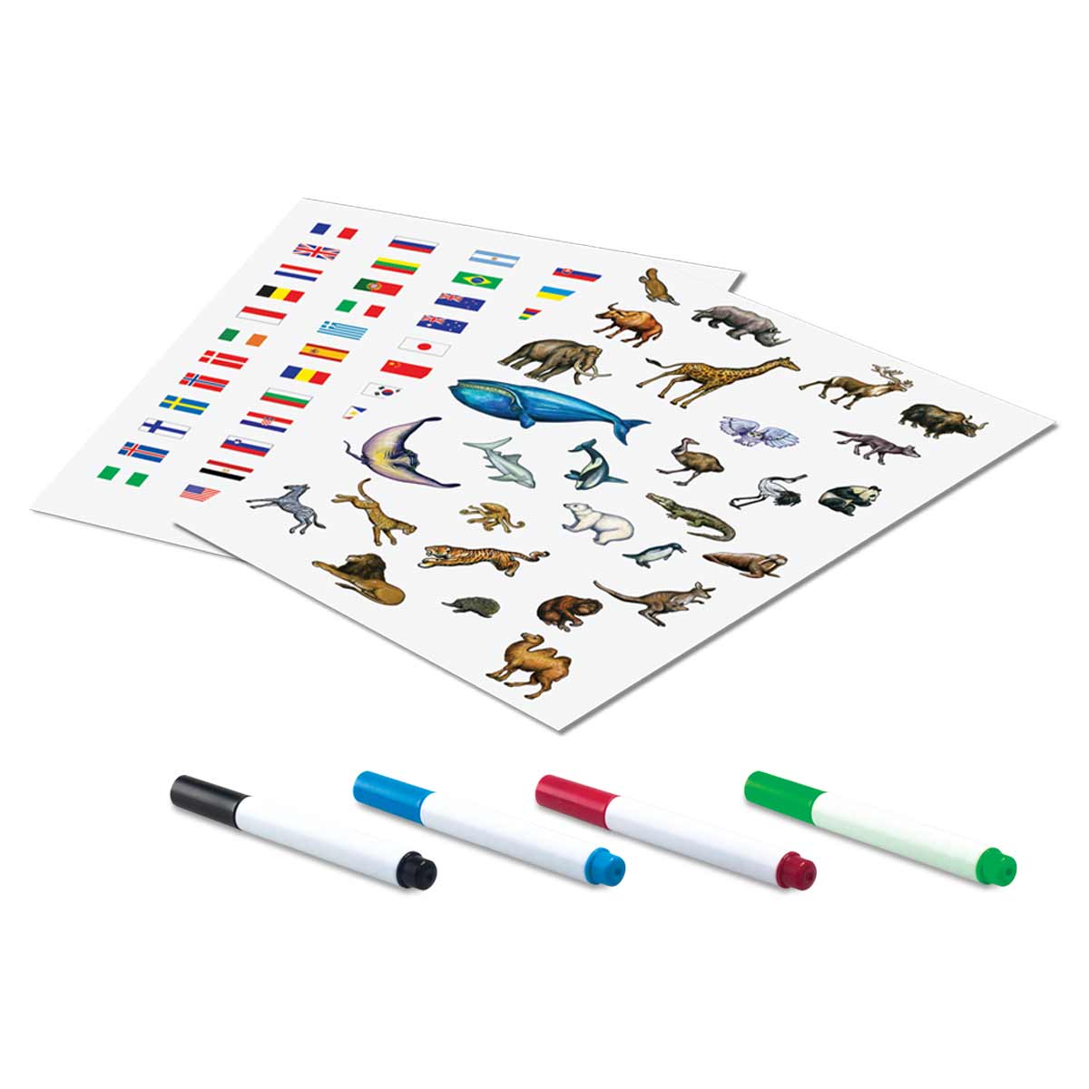 Includes: • (4) Erasable Markers • Static Stickers (Country Flags and Animals) • Globe in 2-Piece Construction with a Sturdy Base